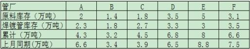 上面樣本管廠主要以華北地區(qū)為主,截至1月17日,天津唐山邯鄲主要管廠統(tǒng)計(jì):廠內(nèi)原料帶鋼庫存25.7萬噸,比上周減1.1萬噸;焊管庫存7.3萬噸,比上周降0.2萬噸;鍍鋅管庫存19萬噸,比上周增0.3萬噸;鋼管平均日成交量4.35萬噸,比上周降0.1萬噸。從數(shù)據(jù)來看,與上月同期相比大部分管廠庫存總量比上月同期有所減少,臨近春節(jié)放假,廠內(nèi)庫存有限,銷售壓力并不大。另外各管廠生產(chǎn)部門普遍在臘月二十左右放假,正月初十左右上班,停工時(shí)間在15-20天,各個(gè)管廠預(yù)計(jì)影響產(chǎn)量在3-5萬噸。